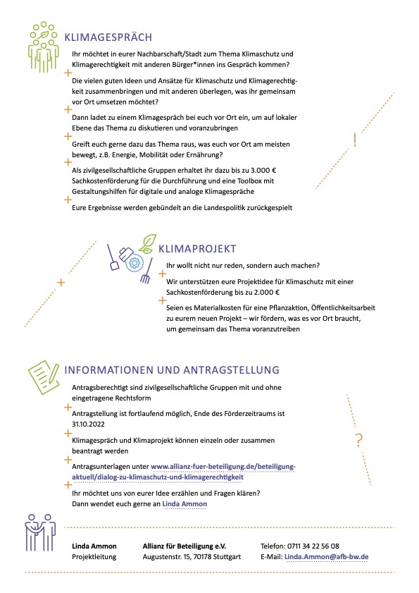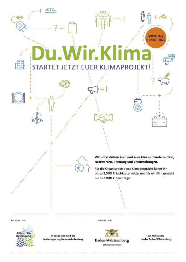 Ihr habt ein Klimaprojekt und sucht nach einer Finanzierung? Oder ihr möchtet in eurer Nachbarschaft ein Klimagespräch auf die Beine stellen? Die Allianz für Beteiligung hat einen Fördertopf eingerichtet, um speziell solche Klimaprojekte und -Ideen zu unterstützen.