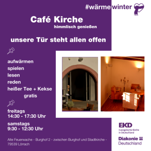 Café Kirche macht mit bei der Aktion #wärmewinter der Diakonie und der Evangelischen Kirche Deutschland (https://www.ekd.de/waermewinter-75181.htm). Gegen soziale Kälte und für Mitmenschlichkeit und Nächstenliebe. Ist es zu Hause zu kalt? Zu einsam? Lust, Leute zu treffen? Aber keine Lust auf Kaffee und Kuchen? Oder kein Geld? Bei uns gibt es eine Gratisecke mit heißem Tee und Keksen. Alle dürfen sich dort gerne bedienen. Auch Spiele liegen bereit. Im Café Kirche darf man auch sein, ohne etwas zu essen oder zu trinken – gerne weitersagen. Unsere Öffnungszeiten: Fr 14:30 – 17:30 Uhr, Sa 9:30 – 12:30 Uhr in der Alten Feuerwache zwischen Burghof und Stadtkirche. Einfach dasein – herzlich willkommen!