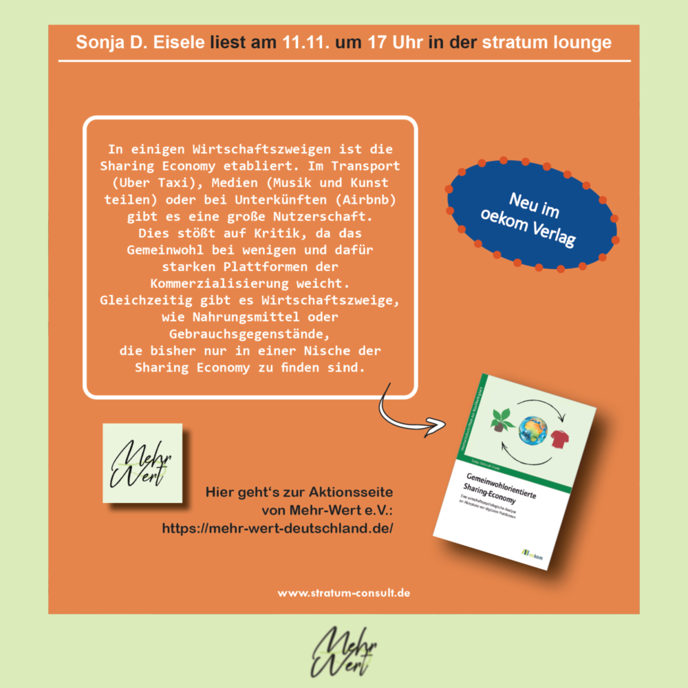 Die Sharing Economy hat sich zu einem gesellschaftlichen Phänomen entwickelt, das einen nachhaltigen und sozialen Lebensstil fördern kann. In diesem Sinne freuen wir uns, Sie herzlich zu einem aufregenden Event einzuladen, das in Zusammenarbeit mit Stratum / Oekom Verlag organisiert wird.