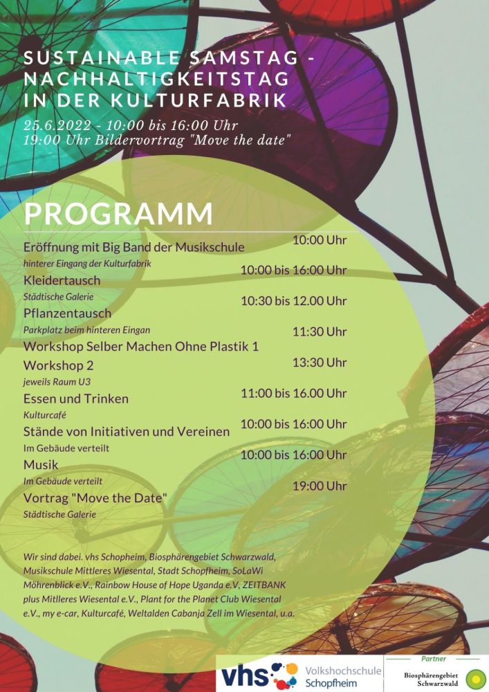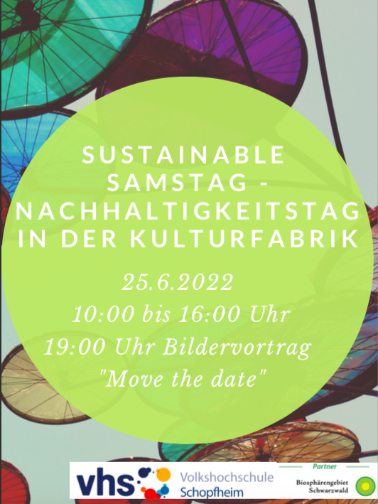 Der Sustainable Samstag wird organisiert von der VHS Schopfheim in Zusammenarbeit mit dem Biosphärengebiet Schwarzwald und TUC ist mit von der Partie. Unten findet ihr das vollständige Programm zum Event mit vielen tollen Workshops und Tauschbörsen, Vorträgen und Musik.