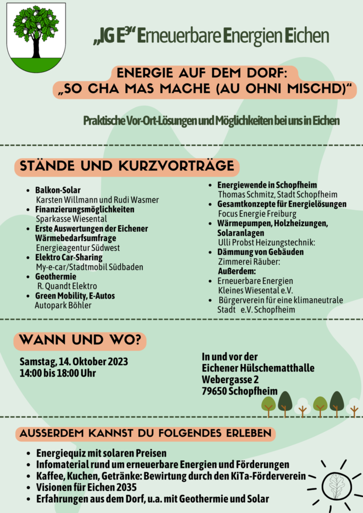 In unserem kleinen Dorf Eichen hat sich, wie ihr vielleicht wisst, die Interessensgemeinschaft „Erneuerbare Energien Eichen/ IG E³“ zusammengefunden, um Potenziale für zukunftsfähige Energielösungen im Dorfausfindig zu machen. Wir möchten die Energiewende als Chance für eine dezentrale, (gemeinschaftliche) Energieerzeugung im Dorf nutzen.