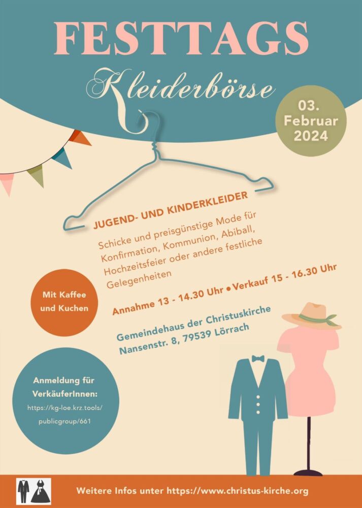 auf unserer Festtagskleiderbörse am 3. Februar kannst Du gut erhaltene, festliche Kleidung in Kinder-, Jugend- und jungen Erwachsenengrößen kaufen und verkaufen.