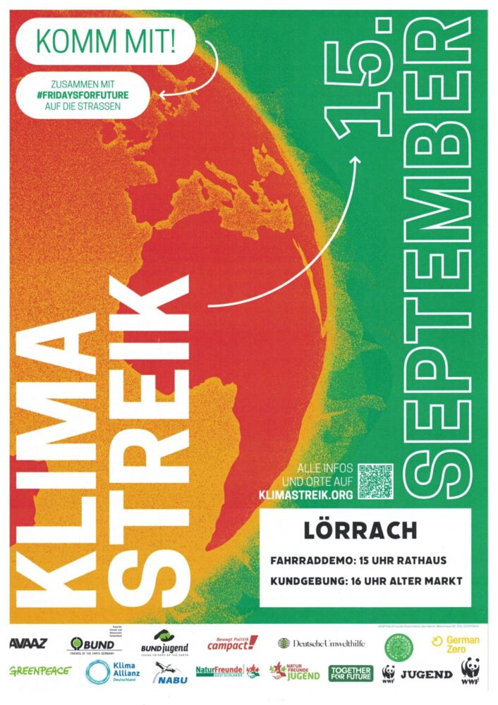 Wir rufen deshalb alle am globalen Klimastreik-Tag, am 15.9.23 um 15 Uhr zu einer Fahrrad-Demo in Lörrach auf!