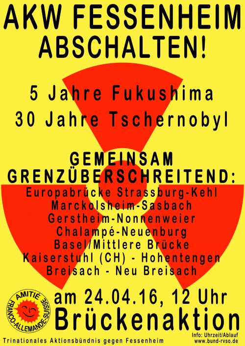 Anlässlich des 30sten Jahrestages der Tschernobyl-Katastrophe finden auf 7 Brücken am Oberrhein Protestaktionen statt, um den Abschaltdruck in Sachen AKW´s Fessenheim und Beznau aufrecht zu erhalten.