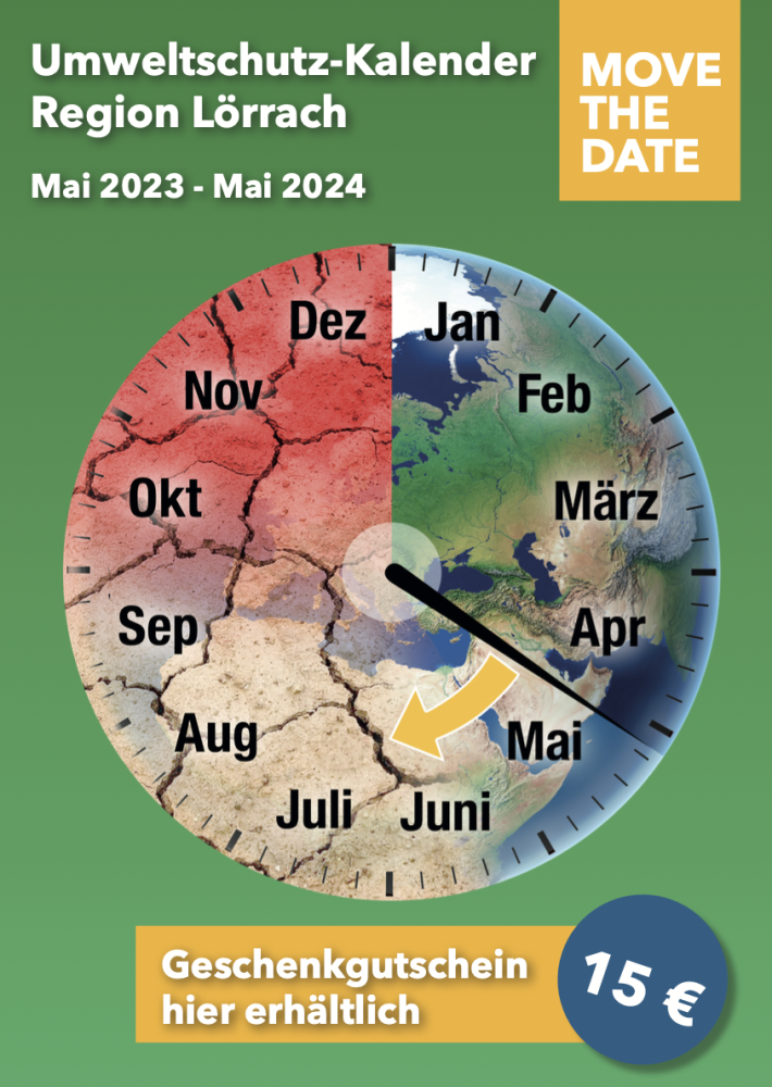 Weil Kalender üblicherweise am Jahresende gekauft werden, gibt es in diesem Jahr für den Umweltschutz-Kalender der Region Lörrach erstmals Gutscheine als alternative Geschenk-Idee, erhältlich am Stand der Kräuterei Mutter Erde auf dem Weihnachtsmarkt am Hebelplatz, im Unverpacktladen Schüttwerk in der Tumringer Straße 221 sowie unter