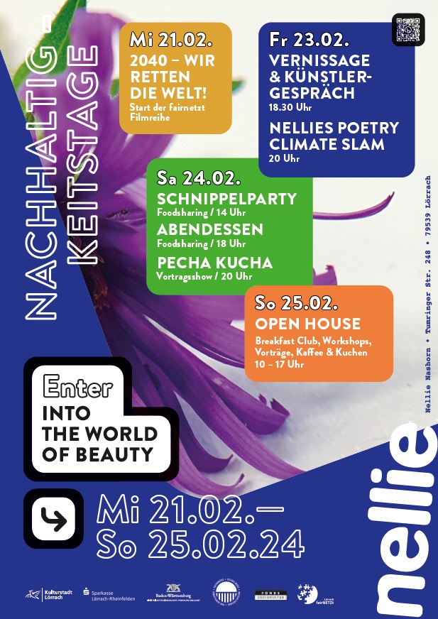 Unsere Welt ist wunderschön – und bedroht. Bei den ersten Nachhaltigkeitstagen im Nellie will das Nellie deshalb genau hinschauen, reflektieren und Möglichkeiten finden Veränderungen anzustoßen. Außerdem lenken die Nachhaltigkeitstage den Blick darauf, wo Gutes gelingt, Fortschritte gemacht werden und Menschen sich für eine lebenswerte Umwelt einsetzen. Es wird gezeigt, wie die Dinge anders gedacht und gemacht werden können. Und wie wertvoll und schön das ist, was wir haben bzw. haben können, wenn wir darauf aufpassen und es wertschätzen. Das Programm der Nachhaltigkeitstage zeigt einerseits das Engagement und die Inhalte vieler Lörracher Initiativen und Personen wie auch Ergebnisse der künstlerischen Auseinandersetzung mit dem Thema Nachhaltigkeit im Rahmen des internationalen Austauschprogramms des Nellies mit seinem englischen Porjektpartner Creative Black Country.