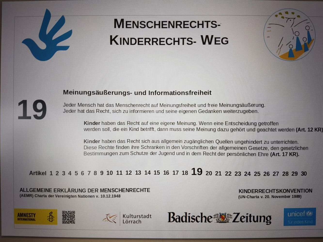 Die Redaktionen der Badischen Zeitung und Die Oberbadische Lörrach, die schon von Anfang an dieses Projekt unterstützen, wollen an ihren Geschäftsstellen auf Artikel 19 – Meinungsäußerungs- und Informationsfreiheit – aufmerksam machen.