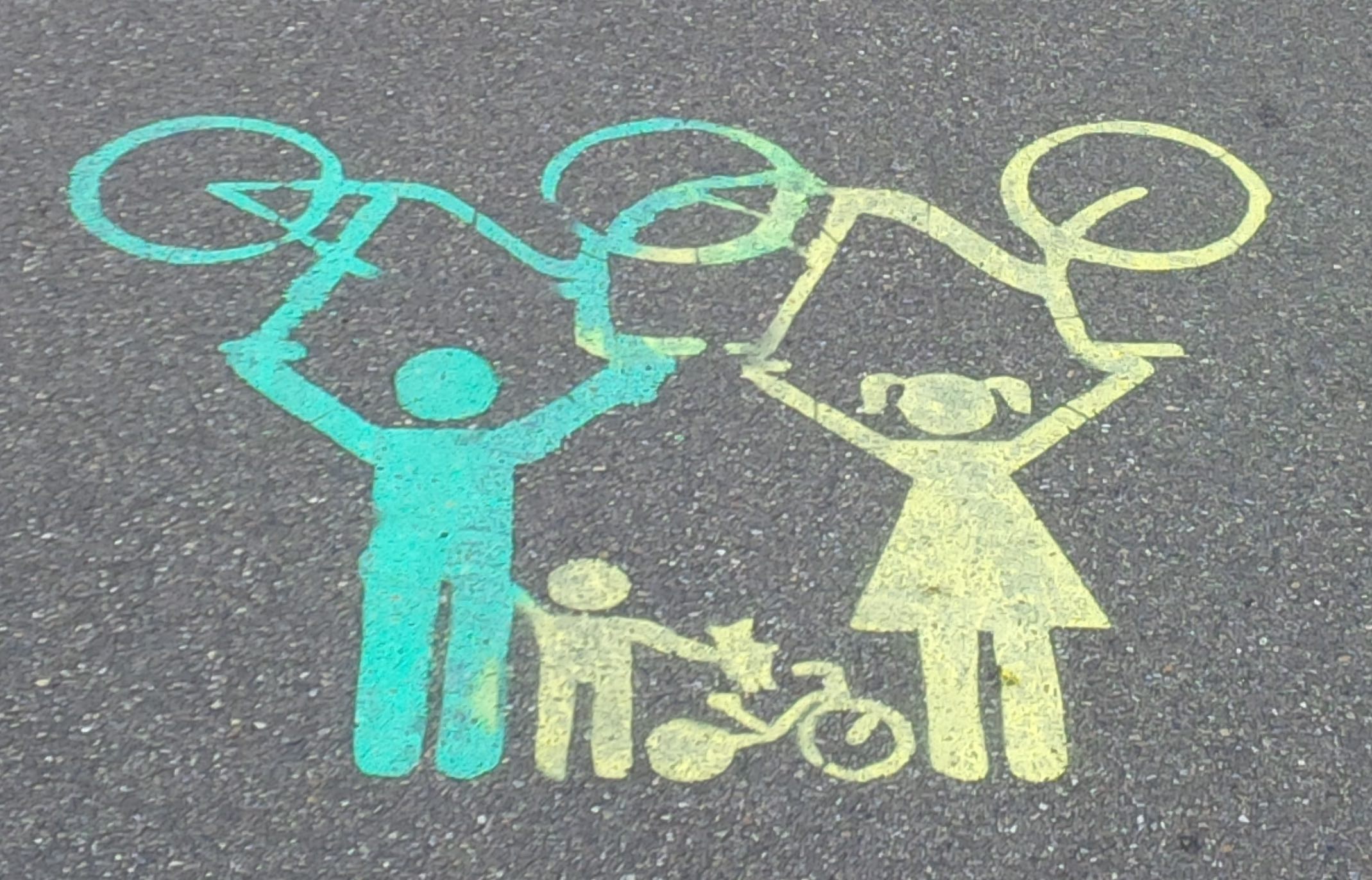 Das Velo-Famlien-Logo hat die Critical Mass Lörrach an prominenten öffentlichen Plätzen in der Lörrach-Innenstadt aufgetragen.